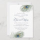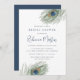 Beautiful bridal shower invitations feature a single peacock feather in soft watercolors, with your event details in a mix of block and script lettering. An elegant choice for modern brides, this design is light and refined without being stuffy and incorporates classic typography and an on-trend watercolor element. Card reverses to coordinating solid blue.