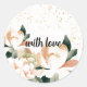 Beautiful soft watercolor peonies in shades of peach and muted gold with dusty sage green leaves. Gold speckles add more style. The words 'with love' can be changed as desired.