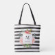 This beautiful bag features watercolor look peonies, and a faux gold frame in the centre. Your initial and name appear within. The background features black and white stripes. We have used art from LABFcreations.