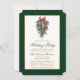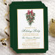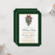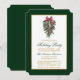 Elegant Calligraphy Script Watercolor Pines Winter Greenery with Burgundy Red Ribbon Bow Christmas Ornaments, Pine Cones and Holly Berries Holiday Party Card - Gold and Green Text