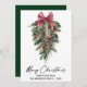 Modern Elegant Calligraphy Ink Script Watercolor Pines Winter Greenery with Burgundy Red Ribbon Bow Christmas Ornaments, Pine Cones and Holly Berries Merry Christmas Card - Green