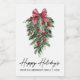 Modern Elegant Calligraphy Ink Script Watercolor Pines Winter Greenery with Burgundy Red Ribbon Bow Christmas Ornaments, Pine Cones and Holly Berries Happy Holidays Mini Wine Bottle Label