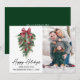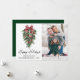 Modern Elegant Calligraphy Ink Script Watercolor Pines Winter Greenery with Burgundy Red Ribbon Bow Christmas Ornaments, Pine Cones and Holly Berries Photo Happy Holidays Card - Green