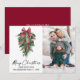 Modern Elegant Calligraphy Ink Script Watercolor Pines Winter Greenery with Burgundy Red Ribbon Bow Christmas Ornaments, Pine Cones and Holly Berries Photo Merry Christmas Card - Red