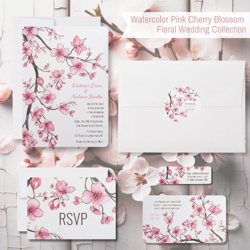 Watercolor Pink Cherry Blossom Floral Wedding Invitation