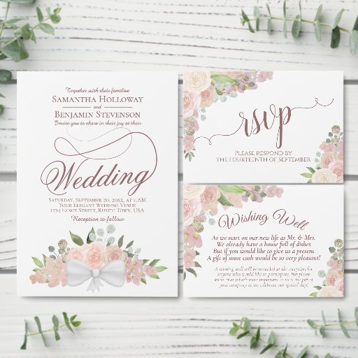 These beautiful wedding invitations feature a rustic yet beautiful hand painted watercolor wreath of blush pink roses, flowers, foliage and sprigs of garden greenery with a white satin bow at the bottom. The design is simple yet elegant with fancy script lettering on a white background. The back features an elegant floral bouquet tied with a white ribbon on a marbled mauve pink background. Beautiful way to invite your friends and family to share in your special day.
