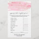 This watercolor pink and gold "Guess The Right Price" game is perfect for a sweet baby girl shower. The front of the game card features "guess the right price", and the back of the card features "what's in your phone". The luxurious feminine design features a light pink watercolor texture with a splash of faux gold glitter dust and an elegant calligraphy script font. Personalise the front of the card with the name of the mum-to-be and baby shower date. You can personalise the game questions by clicking the "customise" button.