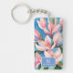 Watercolor Pink Magnolia Modern Art Blue Monogram Key Ring