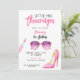 This design celebrates a little fashionista's special day with a chic watercolor illustration of a high heel, lipstick, and sunglasses. The soft colours and girly accents create a stylish and playful atmosphere for a third birthday party.