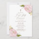 Watercolor Pink Peonies First Holy Communion Invitation. Customisable pink first communion invitation featuring elegant script, watercolor illustrations of blush pink peonies, baby's breath, twigs, foliage and wreath. This floral invitation is perfect for spring, summer and garden first communions. Matching items are available.