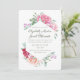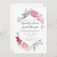 Virtual wedding invitation design features watercolor pink, peach, and red roses and pink violets.
