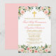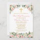 Elegant Watercolor Pink White Floral First Holy Communion Invitation includes pink roses, white flowers and greenery. Gold Cross.