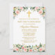 Elegant Watercolor Pink White Floral First Holy Communion Invitation includes pink roses, white flowers and greenery. Gold Cross.