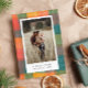 A rustic elegant festive holiday card design featuring a colourful watercolor plaid background in shades of green, orange, red and grey with room with personal photo (vertical or portrait orientation).