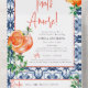 That's Amore! This whimsical Aperol Spritz bridal shower invitation features script text and a watercolor Aperol Spritz illustration. The background is a blue positano style tile. The bottom has a recipe card for guests to bring with them and the back has a matching design.