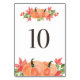 Table 10. Festive table numbers card featuring watercolor illustrations of pumpkins and maple leaves. This pumpkin table number is perfect for Thanksgiving and fall weddings, graduation, baby showers, bridal showers and other events.