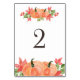 Table 2. Festive table numbers card featuring watercolor illustrations of pumpkins and maple leaves. This pumpkin table number is perfect for Thanksgiving and fall weddings, graduation, baby showers, bridal showers and other events.