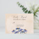 Theme Parties' rustic watercolor RSVP cards design features pretty watercolor purple-blue Gerbera daisies set on matching watercolor swatches over a pastel peach background. The typography is flowing script paired with a traditional serif type. #RusticWedding #Wedding #PurpleDaisies
