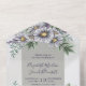 All in one wedding invitation. Watercolor purple and grey daisy-like flowers.