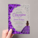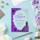Purple silver watercolor floral Quinceanera celebration invitation. Features brunette girl in ball gown dress, script font, silver butterflies, roses and tiara. Perfect for an elegant princess style glam celebration. Personalize with your own details. Stylish transparent or frosted acrylic invitations.