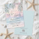 Simple Seaside Watercolor Summer On The Beach Wedding Invitation. The background blends a soft pink, purple, blue, and tan sunset sky that gently transitions into the ocean and sandy shoreline, with the beach set at a slight angle for a modern coastal feel. The artwork stays calm and slightly abstract as waves meet the sand, while palm leaves rest at the top above the horizon for a subtle tropical touch.