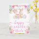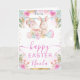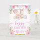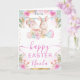 Elegant Watercolor Easter Rabbit and easter eggs design with pink and blue flowers, balloons and gold glitter confetti with a pink stripes background