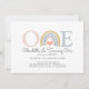 A cute personalised rainbow and hearts first birthday party invitation with a handwritten script type style for baby's name. Adorable pink, blue mustard pastel hues.
