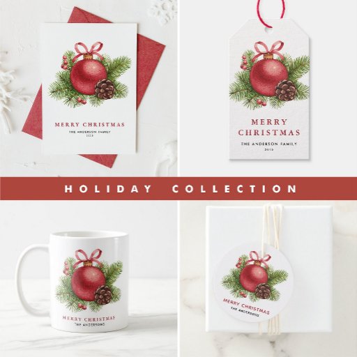 Merry Christmas | Add a festive accent to your Christmas cards and invitations with these holiday envelopes. They feature a holiday pattern of red ornaments, pinecones, pine needles, and winterberries. These custom Christmas envelopes are available in other colours. Matching items are available.