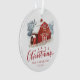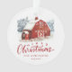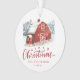 Rustic holiday photo ornament featuring a hand-painted red barn on the front with snow-covered trees in the background. "Merry Christmas" is displayed in a dark red, hand-lettered script. Personalize the red barn Christmas ornament by adding your family name and year on the front with your family photo displayed on the back.