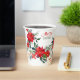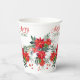 This colourful Christmas paper cup is full of pretty watercolor images of red poinsettia blossom bouquets, with soft green leaves and red and gold berries. The stylised text above the image on two sides says "MERRY Christmas". Everything is placed on a snow white background. Pretty for your Holiday entertaining.