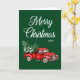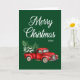 A beautiful folded holiday card featuring modern calligraphy script Merry Christmas with a watercolor vintage red truck, christmas trees and snow. Forest Green background.