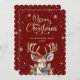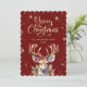 Red and gold calligraphy Christmas card featuring a watercolor painting of a reindeer, holly, red berries and other winter botanicals on a red background adorned by snowflakes.