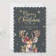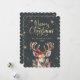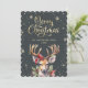 Cute calligraphy Christmas card featuring a watercolor painting of a reindeer, holly, red berries and other winter botanicals on an onyx background adorned by snowflakes.