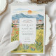 This elegant watercolor wedding invitation captures the warm beauty of Reno, Nevada with a scenic mountain backdrop and glowing desert sunset. The illustration features rolling peaks, the sun dipping behind the horizon, and softly coloured buildings nestled among nature. Wildflowers, succulents, cacti, and tall grasses frame the card in natural tones of green, golden yellow, blush pink, and warm coral. The peaceful colour palette and clean layout are ideal for couples planning a nature-inspired or western destination wedding. The reverse side continues the botanical theme and provides extra space for helpful event details.