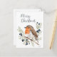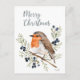 This charming flat holiday card features a sweet watercolor illustration of a European robin perched on a branch of winter berries and foliage. The bird's iconic red breast is beautifully highlighted against the muted greens and dark blues of the berries, giving the design a cozy, rustic, and natural feel. The elegant script lettering reads "Merry Christmas," making this card a lovely choice for sending warm, traditional wishes with a beautiful nature-inspired touch.