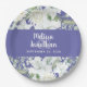Romantic wedding floral paper plates, featuring a delicate watercolor bouquet with white gentle flowers, greenery, and other botanical foliage over a periwinkle purple background. Easily edit the template fields to add your names and wedding date in a classy white font.