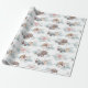 Pretty Holiday wrapping paper done in white, with pale blue ties and watercolor graphics of a pastel pink rose with foliage and pine cone pattern. Matching products are available.