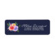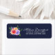 Return address labels with a nice bouquet of watercolor roses with sprigs, leaves and branches all together in a colourful floral arrangement. Navy blue background.