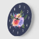 A clock with a nice bouquet of watercolor roses with sprigs, leaves and branches all together in a colorful floral arrangement. Navy blue background. Art deco clock face.