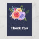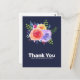A party thank you postcard with a nice bouquet of watercolor roses with sprigs, leaves and branches all together in a colourful floral arrangement. Navy blue background. Personalised message on the back.