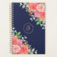 This personalised planner features a modern floral watercolor design with coral and pink flowers, foliage and faux rose gold glitter with monogram on a navy blue background. Personalise the text with your initial.