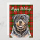 Holiday Card with Watercolor illustration of Rottweiler dog on festive green and red plaid background and customisable Holiday greeting.