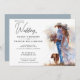A cowboy and his bride stand with their beloved dog , their love immortalised in rustic hues. Our invitation suite captures the essence of your rustic watercolor cowboy wedding with its earthy tones and serene beauty. Each card is adorned with a delicate watercolor illustration of your cowboy couple, the bride radiant in her flowing white dress and cowboy boots, the groom ruggedly handsome in denim and a cowboy hat. Set the tone for your special day with invitations that whisper of romance and adventure under the vast open sky.