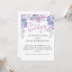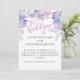 This simple and stylish wedding invitation features a sweet watercolor wreath of pink and lilac flowers and peonies, with modern typography in pink.