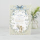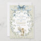 Charming watercolor baby squirrel with blue bow on soft sage green gingham background, framed by delicate forget-me-not florals and leafy wreath. Perfect gender-neutral invitation for a whimsical woodland or cottagecore baby shower. Fully customizable – edit text, colors & more!
