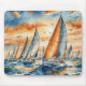 Sailboats racing through the ocean under a vibrant sky filled with fluffy clouds and soaring seagulls