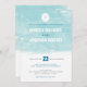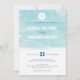 This modern wedding invitation features a soft aqua blue watercolor background and sand dollar graphic.