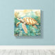 A graceful watercolor sea turtle glides through an underwater world, its shell painted in warm earthy browns, tans, and burnt orange. Flowing strands of seaweed in rich teal, aqua, and blues sway gently around it, creating a serene ocean scene. The soft watercolor texture and calming palette make this piece both peaceful and captivating.