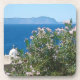 Watercolor sea view with flowers in blossom, white bell tower and sea and mountain view in a Greek island