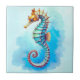 Ceramic tile in a watercolor design of a quirky, colourful seahorse with tan, turquoise, and aqua hues. The coiled tail and bumpy texture give it personality, and the soft turquoise background adds a dreamy underwater feel.